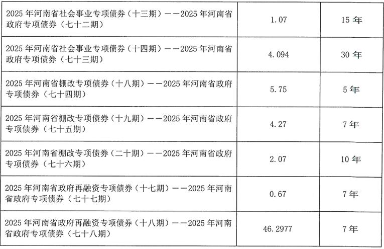 2025年河南省政府专项债券(七十至七十六期)拟发行金额79.052亿元,主要用于74个城乡发展、社会事业、棚户区改造项目。
