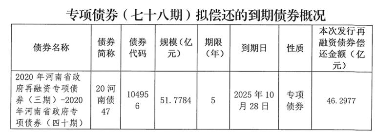 2025年河南省政府专项债券(七十八期)拟发行金额46.2977亿元,用于偿还2020年河南省政府再融资专项债券(三期)-2020年河南省政府专项债券(四十期)的部分本金。