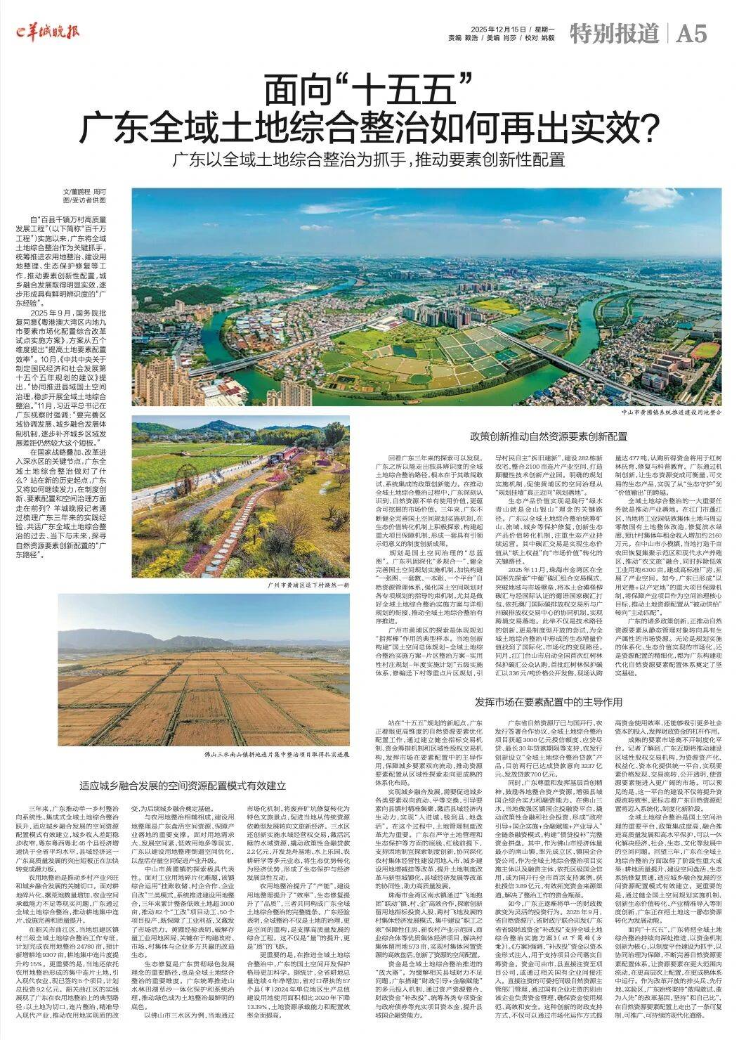 面向“十五五”,广东将把全域土地综合整治持续向深处推进,以资金机制创新为核心,以制度平台建设为抓手,以协同治理为保障,不断完善自然资源要素配置体系,让资源要素在更大范围内流动,在更高层次上配置,在更成熟体系中运行。作为改革开放的排头兵、先行地、实验区,广东始终秉持“敢闯敢试、敢为人先”的改革基因,坚持“和自己比”,在自然资源要素配置上走出了一条可复制、可推广、可持续的现代化道路。