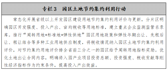 保障产业园区用地需求。推行“周转用地+标准地+弹性供地”产业园区用地政策,根据产业园区近三年平均供地水平,分类预安排新增建设用地周转指标。推行弹性年期出让、先租后让、租让结合等多种工业用地供应制度,降低工业企业用地成本,更好服务产业发展。