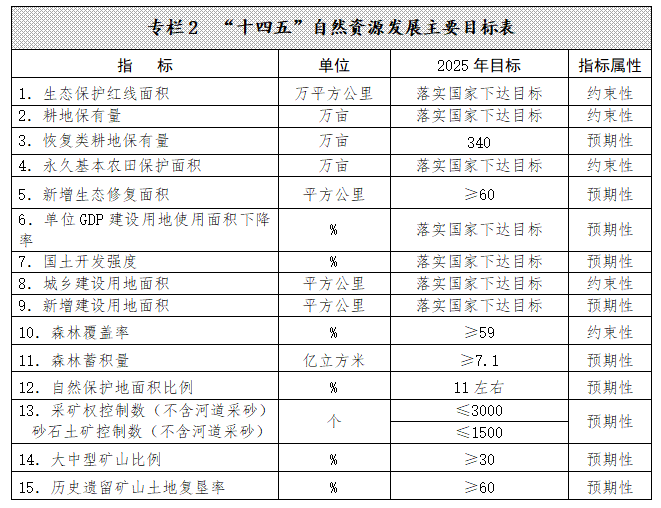 ——自然资源节约集约利用水平明显提升。资源总量管理、科学配置、全面节约、循环利用的模式和管控体系基本建立,单位GDP建设用地使用面积下降率达到国家下达目标,大中型矿山比例达到30%以上。