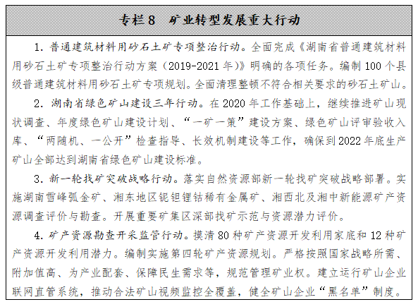 支持省属国有矿企整合我省优势矿产资源,引导省内头部矿企通过强强联合、兼并重组、境外并购和投资合作等方式,收购或控股一批勘查、开采、选冶加工企业,促进规模化、集约化经营。针对不同的优势矿种,实施不同的产业发展政策,培育一批我省优势矿种的特色矿企。建立优势矿产交易平台,提高全省矿业企业行业地位,实现从产品优势到市场优势的转型,提高湖南优势矿产话语权。