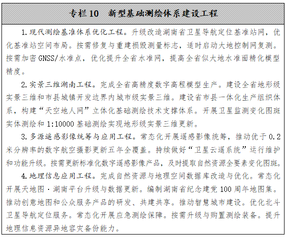 推进新型基础测绘体系建设。在做好全省1:10000地形图和市县城镇开发边界内1:500地形图生产更新的基础上,以“满足要求、贴近需求”为导向,推进新型基础测绘体系和实景三维湖南工程建设,建立以实景三维湖南为核心的新型基础测绘产品体系,带动生产组织体系、标准政策体系、技术支撑体系和应用服务体系的全面重构。按照“试点验证、按需精化、以用促建、省市联动”的思路,基本建成覆盖全面、更新及时、管控精准、立体直观、承载力强的实景三维湖南和省级统筹、联动更新、开放共享、按需服务的湖南省新型基础测绘体系。