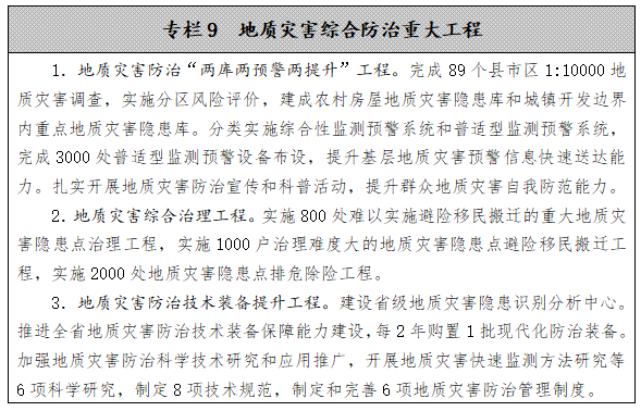 实施地质灾害技防建设工程。推进省市县三级地质灾害防治技术装备保障能力建设,配置空天地一体化数据采集、传输、通讯、指挥等防治现代化专业装备,提升地质灾害防治信息获取、通信保障、数据分析和技术支撑能力。为群测群防员配备升级基础性装备。